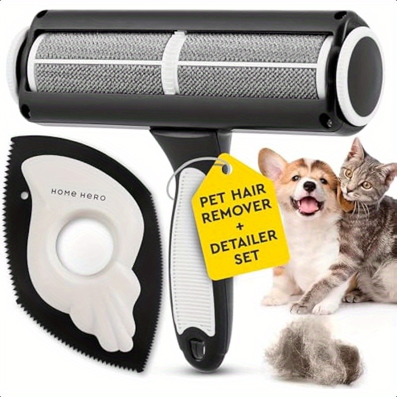 The video showcases the product in use.,The video guides you through product setup.,The video compares multiple products.,The video shows the product being unpacked.,Ergonomic Handle,Home Hero Pet Hair Remover features a comfortable silicone grip handle to avoid hand fatigue. Its ergonomic design ensures comfy extended use.,Large Storage Compartment,This pet hair remover's large storage holds more hair than most rollers. Plus, enjoy easy hair disposal with the push-open lid.,Reusable,S